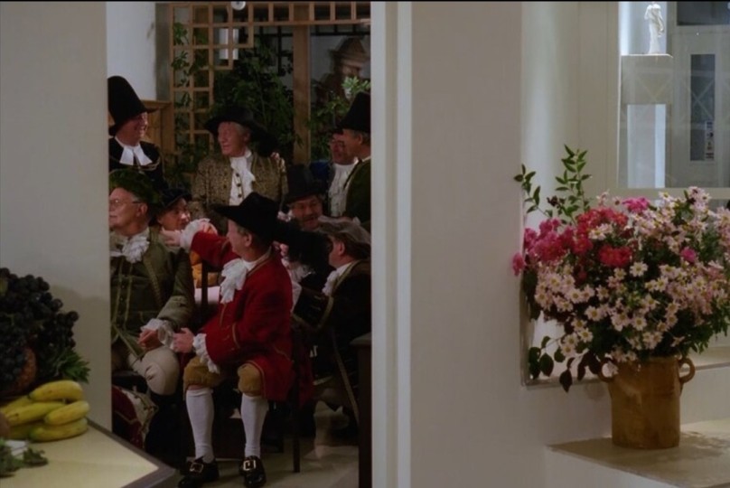 (B) 命题:它以考古/人类学式的气氛为前端却不把学术作为冷静工具,而让「学术」成为引发幻象的催化剂;文本与影像之间互为镜像:文本把故事压缩成引子,而影像则放大那些不被文字容纳的肉体残响。 步骤1—中性的书桌、标本玻璃、乾燥的标签、翻开的箱签,每一个学术场景都像是将「意义」排列在秤盘上等待被称重;但每当镜头靠近那一排字母或丝绒包裹的器具,那些符号便不再只属于被医学化的过去,而像是血迹中的字条,让叙述器(记者、学者)从客观走向参与。 步骤2—记者的视野被引导去看一具被重新排列的骸骨,骸骨的位置、破坏的痕迹和周围遗留的绳结或布片,像一组未被翻译的符码,于是视觉本身成为解码的手段;每一次镜头在骨盆、颞骨、牙齿上停留,都像在读取信号而非历史文件。 步骤3—片中出现的宴会、化妆舞会、教堂内的静默以及公路或车厢的运动,成为不同的身体场:在宴会上身体互为注视,在教堂里身体被静待,在行车间身体又被时间折叠,这些场域之间的转换本身即是一种身体的地志学。故而在此学术的出发点被电影化成一场感官的考古,影片不断示范如何从对象(骸骨、文献、叙述者)回到主体(记者、观者、国族)之间的微妙距离,而每一次摄影机的靠近都是对距离的一次测度与破裂。 在影片的某些宴会场景里(可参见剧照中那一列穿著十七世纪服饰、帽饰繁复的群像,灯光柔和却在衣褶与脸庞边缘刻出锐利的阴影)那群人在画面的左侧密密麻麻排列,他们的身体以一种近乎舞台化的姿态存在,而画面右侧则空出一个框架式的门廊,那门廊像是历史与当代的接缝,或许那里有鲜花、或许只是几片叶子在风中抖动,这样的左右分割让观者的视线被分散到「群体的面具」与「空缺的注视」之间,而长镜头常常在群体与空白之间缓慢推移,使得时间像胶状物般被拉长并呈现为可触的粘稠感,在这种拉伸里,人的胸腔、人的饮酒声、人的笑声都像是不同频率的钟声,互相重叠并造成一种共振,那共振并非音响学上的回声而是记忆的回声,它让观者的胸口产生一种回应,好似有一块被遗忘的器官被重新唤醒,而这个器官的作用不在于辨别事实,而在于感觉事实如何被身体所承载,于是历史成了一种可以被触摸的表层。 那祭坛背后的暗巷,碑文在夜风中轻微颤动。宴会场景在构图上极爱用门框与廊柱来做空间切割,往往画面的左侧是多人围坐的群像,右侧则为一条被刻意留白的通道或门廊;镜头经常从门廊外朝内推,或从群像中抽出一个人物的半身来与那个空白框架对照。人物的动作有节拍的重复(举杯、交谈的手势、转头),摄影机在节拍之间选择停格的瞬间,把群体的动态“冻结”为一组纹理。音乐在这些集体场景中使用合唱或类中世纪旋律的片段,以单纯的直线旋律加上复调人声来制造一种时代感,同时底层又混入当代的弦乐填充,使得古与今并列出现。功能上,这种声像安排把宴会既定为公共记忆的舞台:群体的仪式感被音乐放大,而门框处的留白成为观者穿越时间的缝。